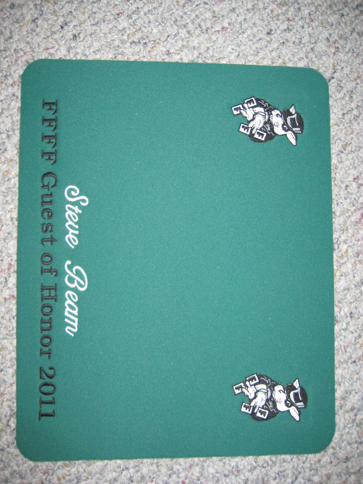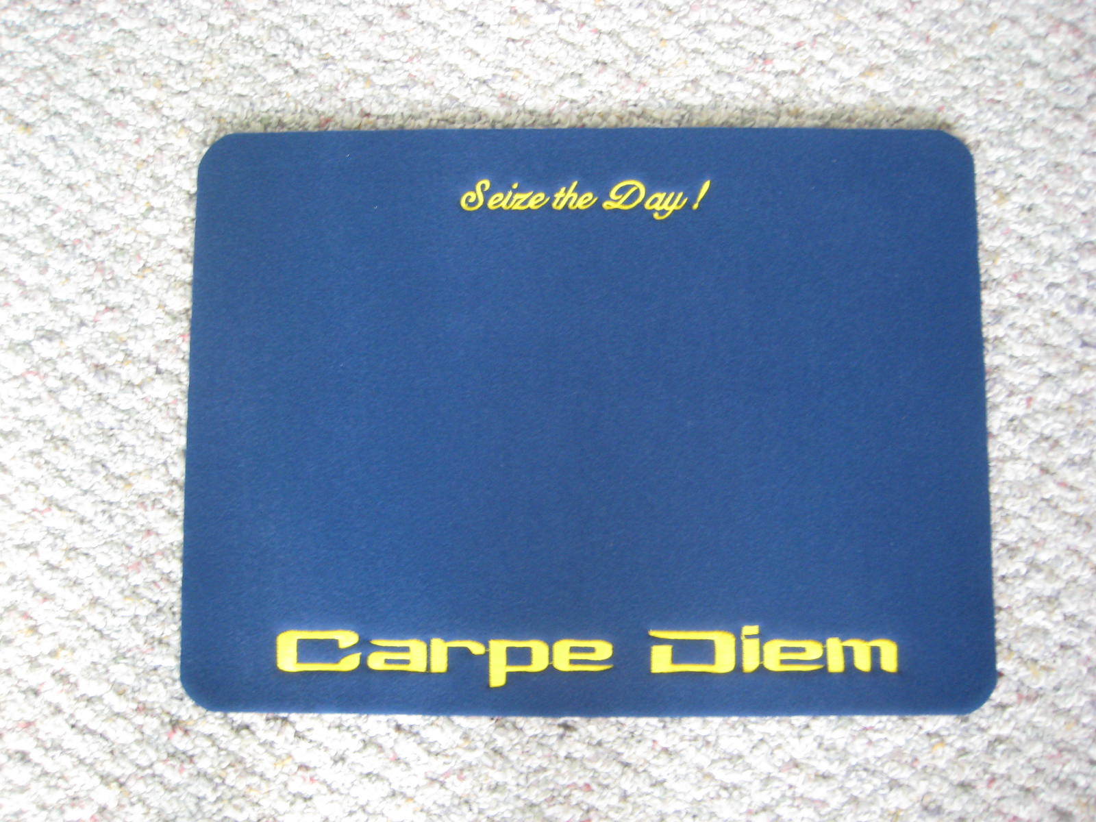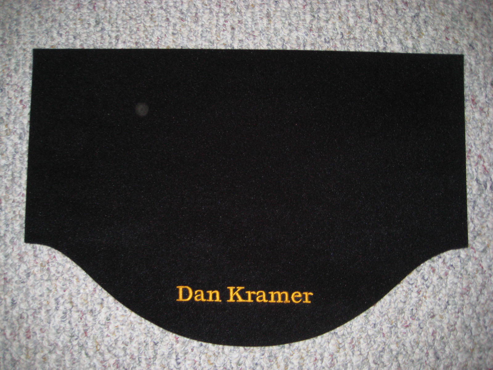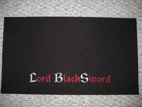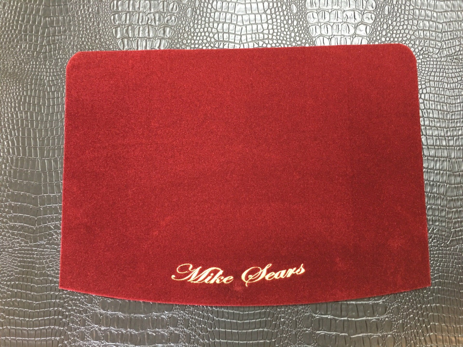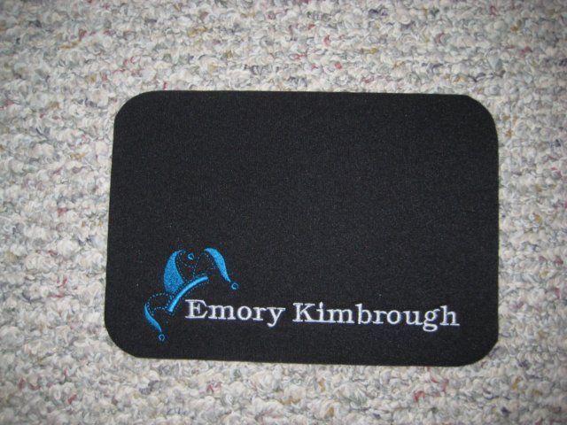 If you have your own Logo, and want that on your mat, here is the process. Any custom logo must be "digitized" into a program the embroidery machine can read. This is a one time fee, and the cost is determined by the programmer. This cost starts at $25.00, and is determined by the complexity of the design. We will give you a free quote before any work is done.You need to send me a jpeg image of your logo and the dimensions ( length X width) of your logo. Once your logo is digitized, it can be only be enlarged or reduced by 20%. You can also order shirts and other items with this logo for your personal use. Inquire for pricing.